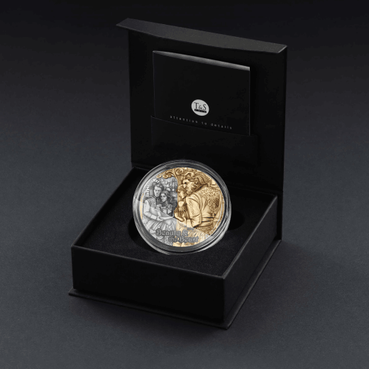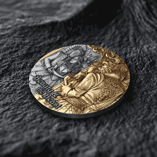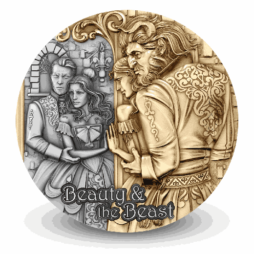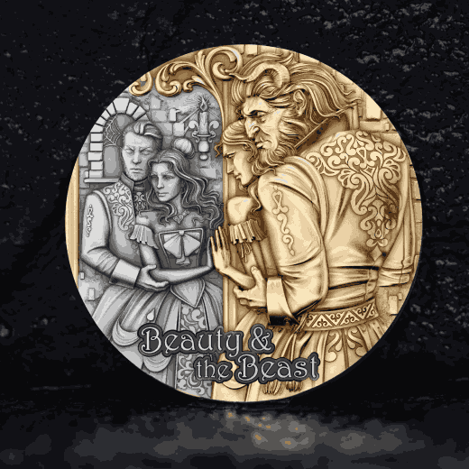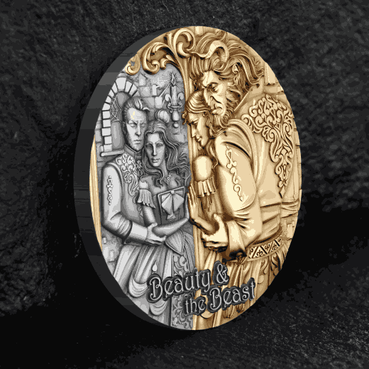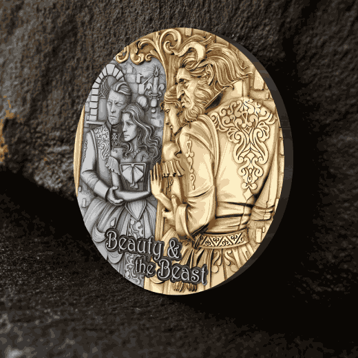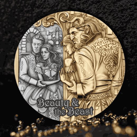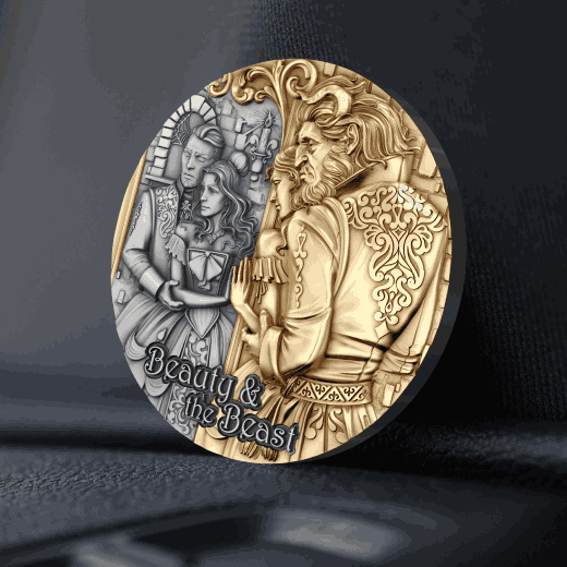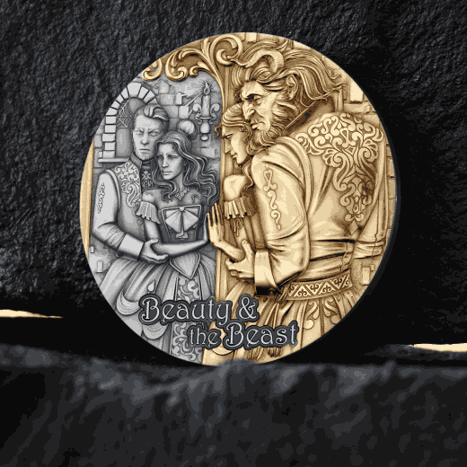 Beauty and the Beast coin represents two parts of the story separated by a mirror. Intricate designs come to life in stunning relief, creating a sense of depth and texture that mesmerizes the beholder. Although the flawless gold-plated side hides many unspoken secrets, the beast looks fierce, but on the other side, in the mirror, we will find reflected the fragility and naturalness of this side, when love and familiarity warm the heart.