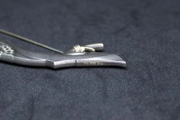 Struck from 2 troy ounces of .999 fine silver, the piece features a beautiful antiqued finish. This adds depth and character to the overall look. Additionally, its unique crescent shape gives it a sculptural, artistic quality that stands out from traditional bullion.