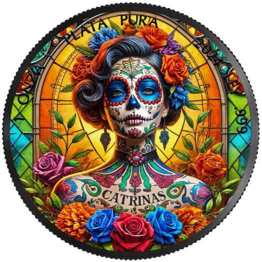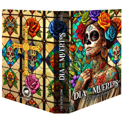 Tags: 1 Oz Silver Coin, 2024 Silver Coin, Artistic Coin, Cultural Collectible, Day of the Dead Coin, Dia de Los Muertos Coin, Fine Silver Coin, Holiday Coin, Limited Edition Coin, Mexican Heritage Coin, Numismatics, Precious Metals, Skull Design Coin, Stained Glass Coin, Unique Silver Coin