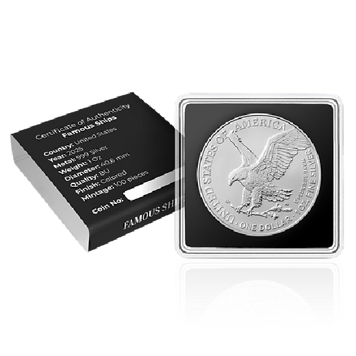 Discover the BISMARCK – Famous Ship Series – 1oz .999 Silver Eagle Coin $1 USA 2025, the second issue from the Famous Ship Series, also includ: exquisite craftsmanship and historical significance. This remarkable piece, reflecting impeccable detail and fine silver purity, is a must-have for collectors.