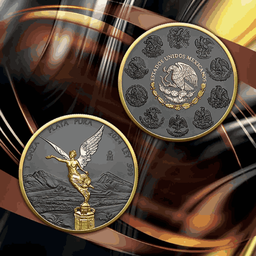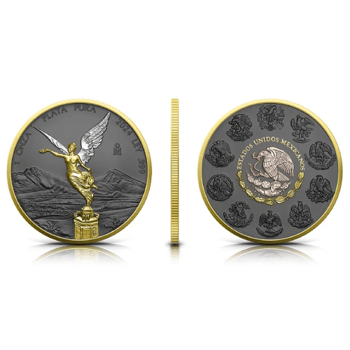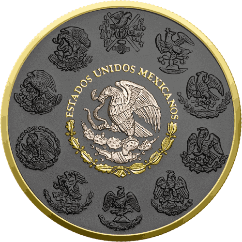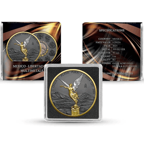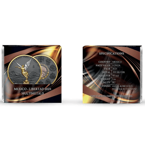 The reverse displays the Winged Victory statue standing before the Mexican volcanoes, Popocatépetl and Iztaccíhuatl. In this edition, the artistry is elevated by rich contrasts of gilded gold, dark ruthenium, and warm rose gold highlights. These layers create depth and drama while preserving the beauty of the original design. On the obverse, the Mexican coat of arms appears with its surrounding historical variations, enhanced by the same Multimetals treatment.