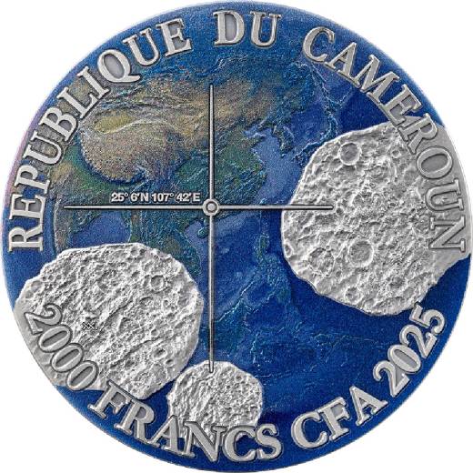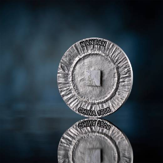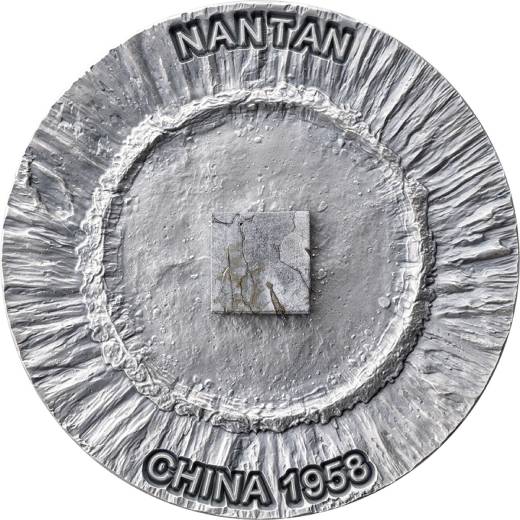 The Nantan coin features an extraordinary centerpiece on the reverse: a genuine fragment of the Nantan meteorite, discovered in Guangxi, China, in 1958. Originating from the asteroid belt between Mars and Jupiter, this ancient traveler spent millennia journeying through space before reaching Earth.