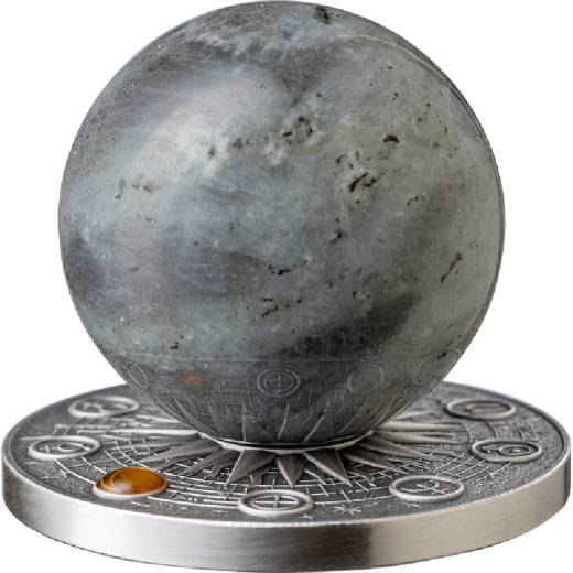 Introducing the Earth’s eternal celestial companion — the Moon. The 35-mm Labradorite sphere shimmers with silvery lunar light, its surface marked by soft craters and shifting