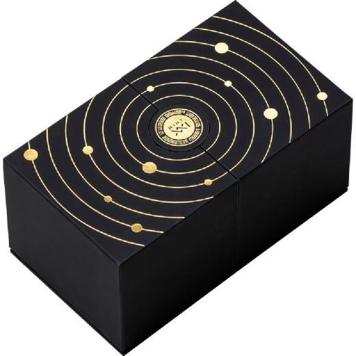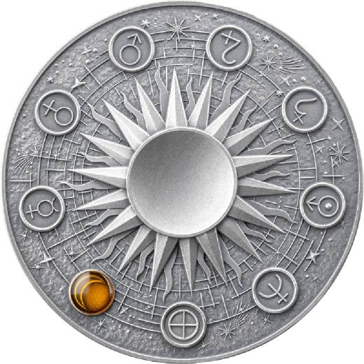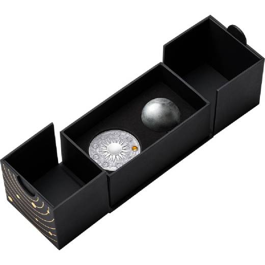 At its base lies a 2 oz silver coin, with the Sun engraved at the center — a symbolic balance of night and day. Digital gilding highlights the Moon’s astronomical symbol, glowing quietly in the cosmic dance.