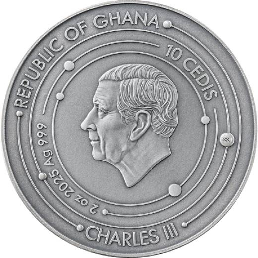 A 2 oz high-relief silver coin forms the base, highlighting Saturn’s astronomical symbol on the reverse and celestial coordinates around the edge.