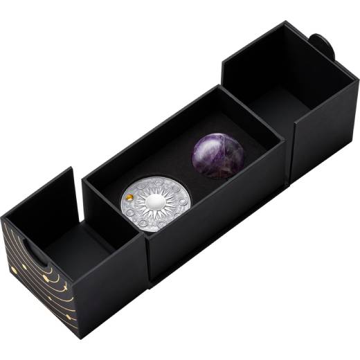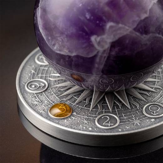 A two-piece premium coin set by MINT XXI, inspired by Saturn. The magnificent giant of the Solar System is represented by a 35-mm amethyst sphere as its centerpiece, with unique natural patterns and deep violet shadows. The stone reflects Saturn’s stormy atmosphere — marked by hurricanes, fierce winds, and bizarre storms at its pole.