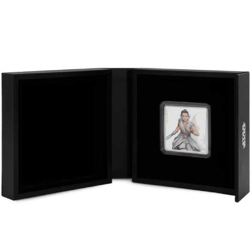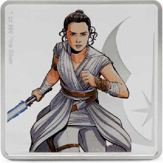 - The dual-sided design features Rey holding her Lightsaber in color. Engraved in relief and texture behind is the Jedi crest.