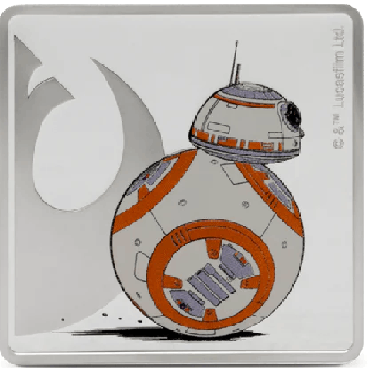 - Turn the medallion over to find astromech BB-8 in color, offset by the Rebel Alliance Starbird.