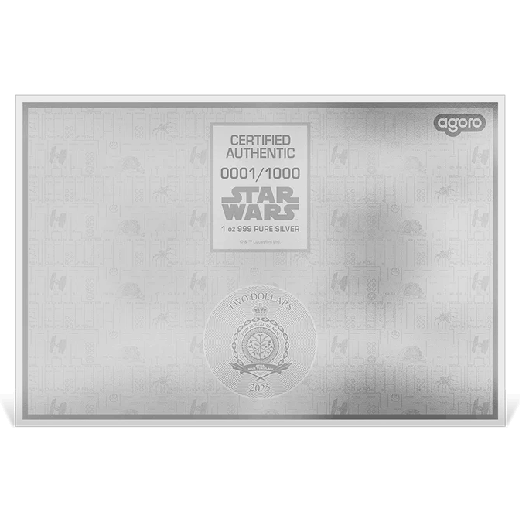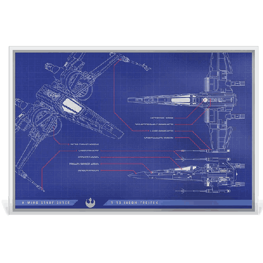 The fifth release in the STAR WARS™ Blueprint Series brings the sleek T-70 X-Wing™ to life in pure silver. Struck from 1oz, this collectible foil features a schematic breakdown of the starfighter made famous by the Resistance, complete with blueprint styling, detailed linework, and red callout lines.